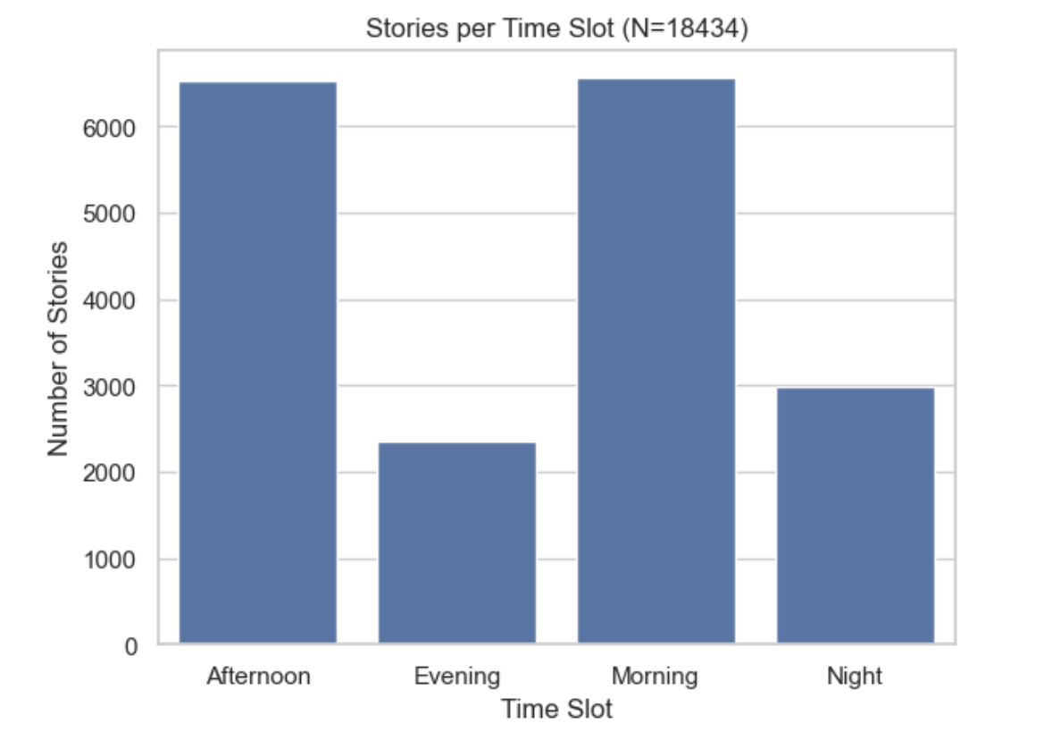 I plotted the number of stories per time slot. The number of stories published in each time slot is very different.