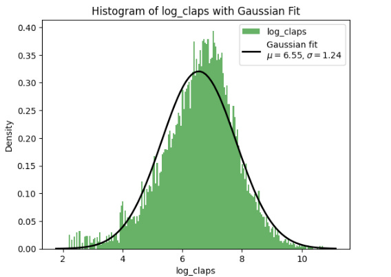 I removed outliers with a Z-score larger than three and fitted a Gaussian (normal) distribution using the log_claps data. The transformed log_claps histogram is relatively close to normal but skewed slightly to the right.
