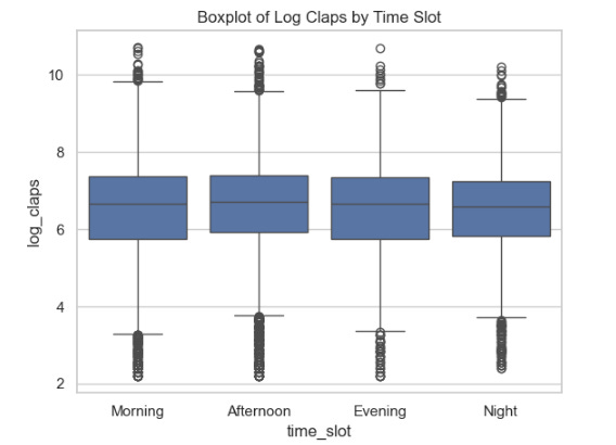 I plotted the average log claps per time slot, and the result shows little difference in claps. Morning (6.538) is slightly lower than Afternoon (6.609) but higher than Evening (6.513) or Night (6.482). Are these minor differences statistically significant?