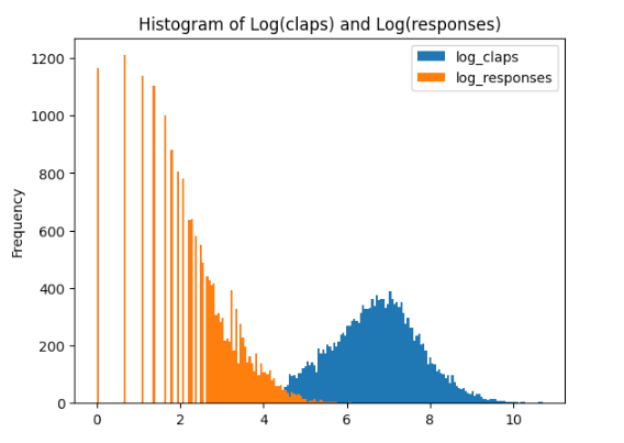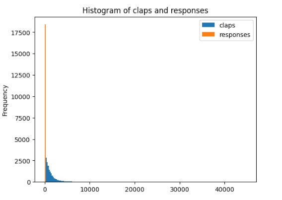One of the first things I noticed was that the histogram of “claps” and “responses” shows that data doesn’t follow a normal (gaussian) distribution. There are only handful of stories with over 10,000 claps, and thousands with less than 1,000 claps.