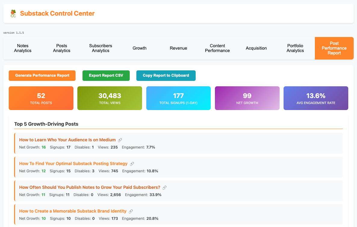 If you want to try the same workflow for your own Substack, you’ll need the Substack Control Center. Version 1.1.5 introduces the Post Performance Report, providing growth vs. churn analysis that powers this process.