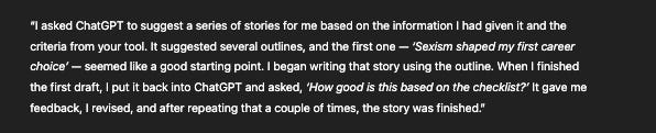 “I got your email with step-by-step instructions to analyze my stories, and the feedback was fascinating. I asked ChatGPT to build a checklist I could use for future drafts.