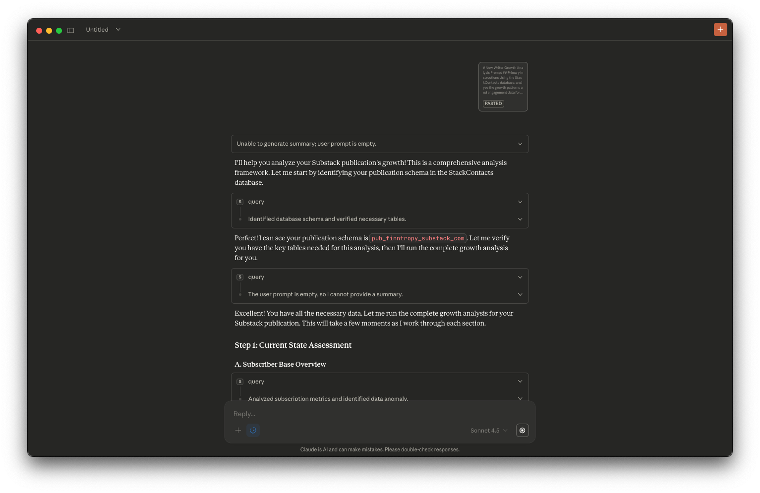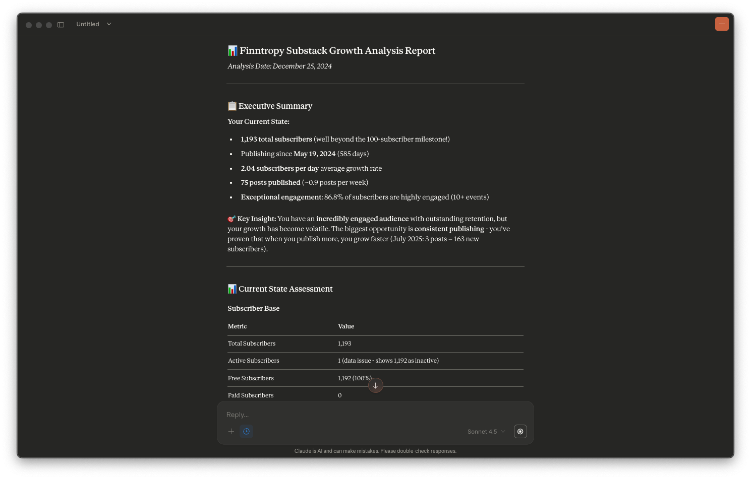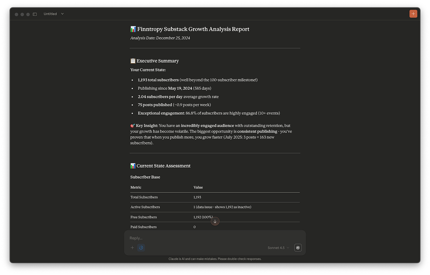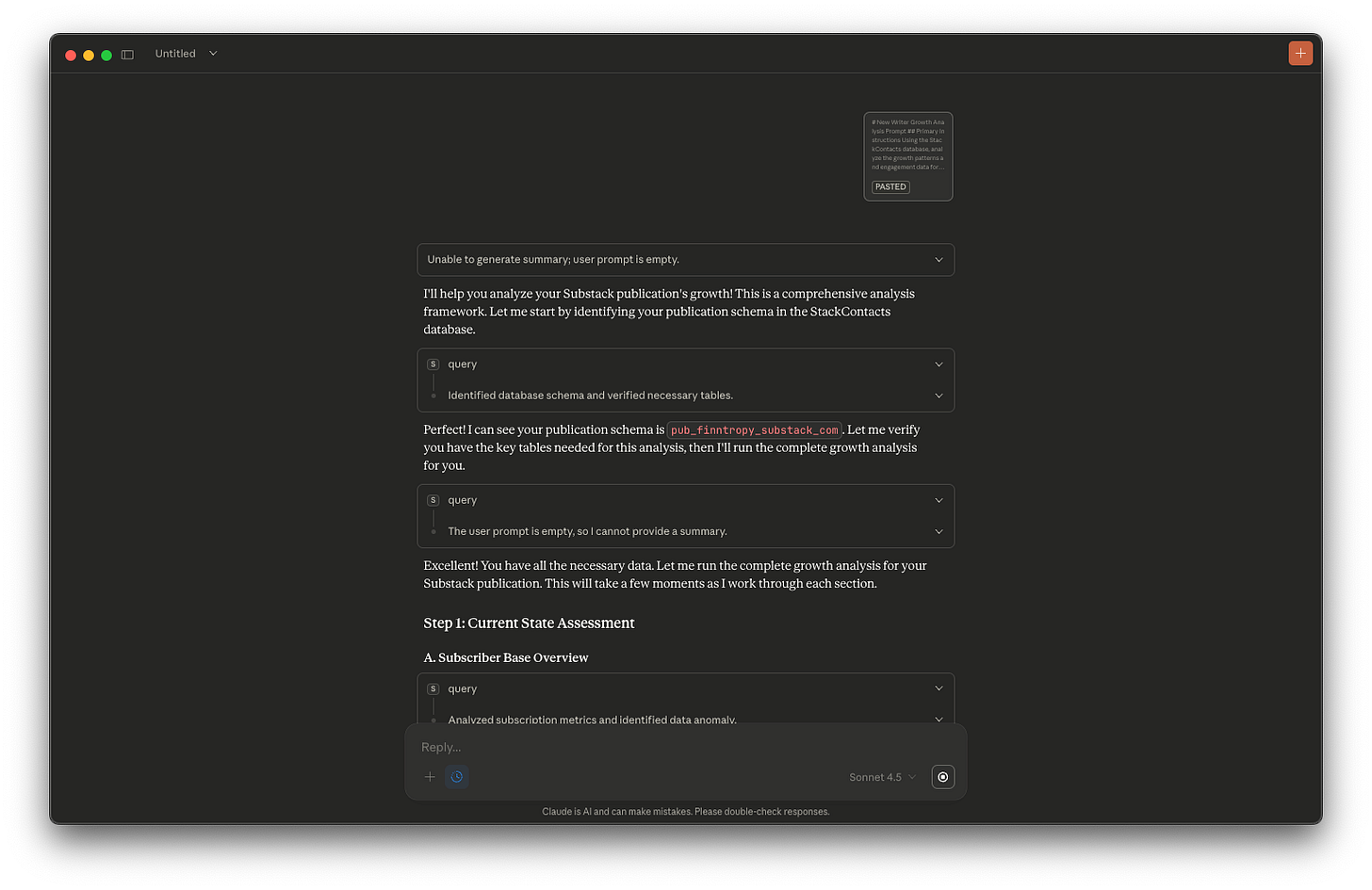 Try it now. Replace `[publication]` with your schema name and paste into Claude. You’ll have a complete growth analysis in minutes.